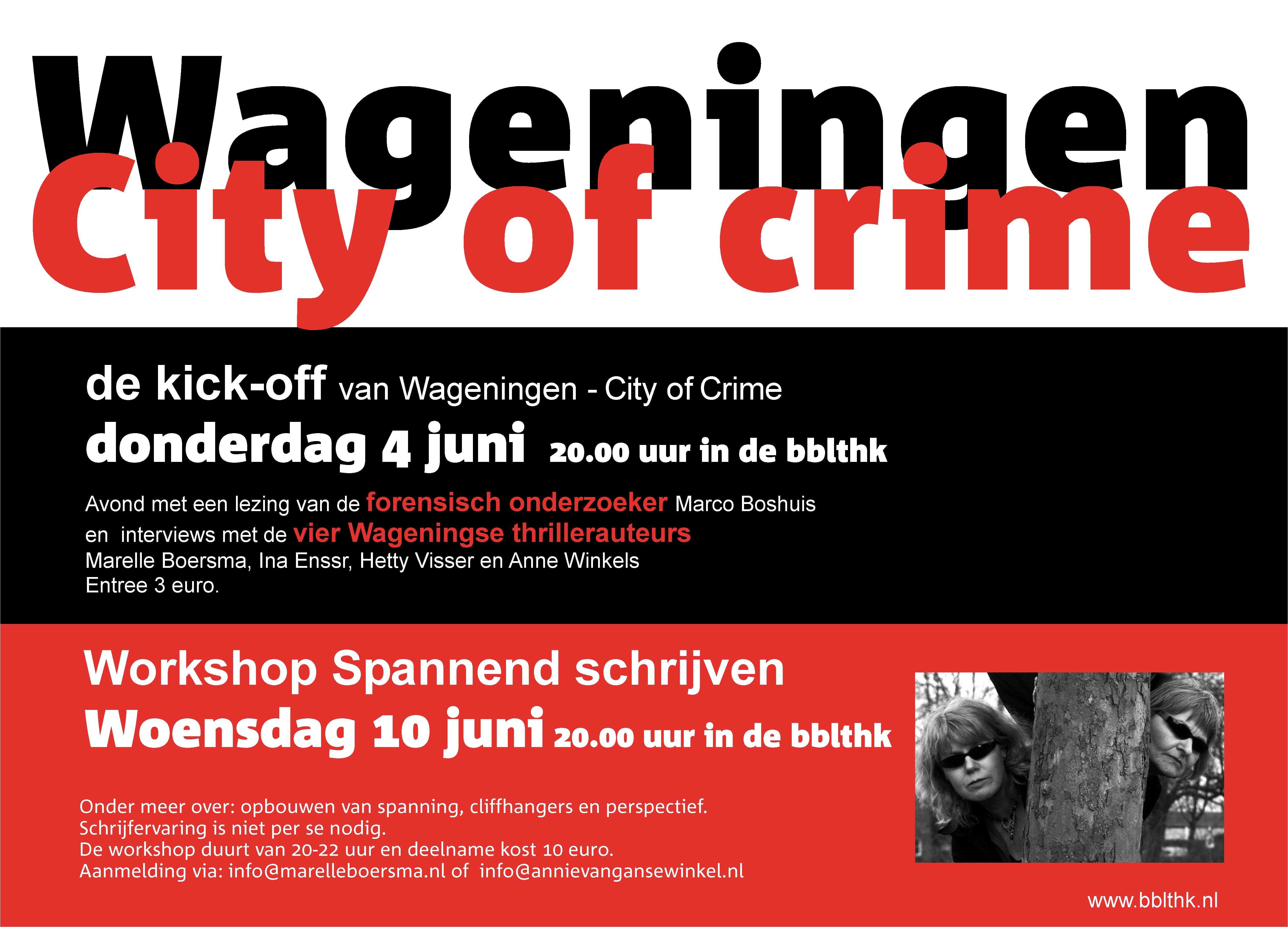 In 2009 bedacht ik samen met thrillerschrijver Jaap van Raffe Wageningen, City of Crime voor de Maand van het spannende boek. Thrillerauteurs Marelle Boersma en Hetty Visser sloten zich enthousiast bij ons aan en met ons vieren